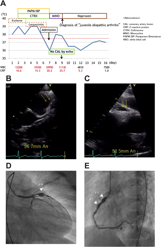 (A) Early clinical course in Case 2. After treatment with several courses of antibiotics, the patient was diagnosed with juvenile idiopathic arthritis. Following this diagnosis, his fever was eventually controlled by oral naproxen. He underwent echocardiography at 9 days into the illness; however, coronary artery lesions were not observed. CAL, coronary artery lesion; CRP, C-reactive protein; CTRX, ceftriaxone; MINO, minocycline; PAPM/BP, panipenem/betamipron; WBC, white blood cell. (B) Echocardiogram of case 2 at school cardiac screening. The parasternal short axis of the aortic root demonstrated the presence of a left coronary artery aneurysm of 7 mm in diameter at #6 (arrows). (C) Echocardiogram of case 2 at school cardiac screening. The parasternal short axis of the aortic root demonstrated the presence of a right coronary artery aneurysm of 5 mm in diameter at #1 (arrows). (D) First coronary angiogram of case 2. Left coronary angiography demonstrated a coronary artery aneurysm of 6.5 mm in diameter at segment 6 (white ▼). (E) First coronary angiogram of case 2. Right coronary angiography demonstrated coronary artery aneurysms of 5.1 mm, 4.8 mm, and 3.9 mm in diameter at proximal segment 1, distal segment 1, and segment 2, respectively (white ▼).