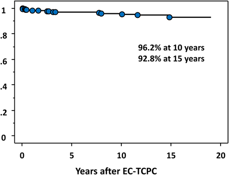 米国Mayo Clinicにおける1973年から2012年までの40年間における1,052例のFontan手術患者(Atriopulmonary connection(APC)法59%,Lateral tunnel(LT)法25%,Extracardiac Conduit(EC)法11%)のまとめによると,術後10年生存率は全体で74%,術式別ではAPC法70%,LT法75%,EC法94%であったが,2001年以降の症例では術後10年生存率は95%と大きく改善している2).またAustralia and New Zealand Fontan Registryによる1975年から2010年までのFontan術後患者(院内死亡83人を除く)1,006人の退院後追跡調査では10年生存率はAPC法89%,LT法97%,EC法97%であった3).術式別の遠隔成績の報告ではAPC法耐術の215例(観察期間中央値26年)では,遠隔死亡が52人,心移植が12例,take downが3例,Fontan conversionが39例で,20年の累積生存率およびFontan failure回避率は82%,および66%であった4).StammらはBoston小児病院における220例のLT法の遠隔成績(平均観察期間10.2±0.6年)を報告した.早期死亡を12例,遠隔死亡を7例に認め,4例がFontan take down, 4例が心移植を行い,術後10年の累積生存率およびFontan failure回避率は91%,87%であった5).我々はEC法の単独施設成績として500例のまとめ(観察期間中央値6.7年)を報告した.早期死亡2例,遠隔死亡17例認め,術後累積生存率は10年で96.2%,15年で92.8%であった(Fig. 1)6).これらの結果には手術適応,周術期管理法,術後管理法の違いなど時代背景の影響が大きく単純に術式のみの比較はできないが,EC法Fontan手術における良好な中期遠隔成績の報告が多い.