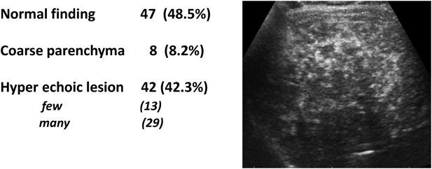 Fontan術後に生じる急性および慢性の肝構造異常および肝機能障害はFontan associated liver disease(FALD)と呼ばれ,近年大きな注目を集めている.慢性的な静脈圧の上昇と低心拍出が大きく影響していると考えられる.成人に達したFontan患者241例の検討(年令中央値25.8歳,術後経過中央値20.3年)ではほとんどの患者で様々な程度の肝線維化が見られ,約1/3の症例で肝硬変が見られ20),最終的に肝がんの発生素地になり得る21).腹部超音波検査での異常所見は不均一な肝実質所見や単発または多発性のhyper-echoic lesion(Fig. 2)がFontan術後遠隔期の患者の多くで認められ22),肝生検では類洞拡張,小葉中心性壊死,門脈線維化などの所見が特徴的である23).心臓カテーテル検査および一般の血清生化学検査,また血清線維化マーカーと画像所見,生検所見は必ずしも相関しない.FALDはFontan術後年数とともに増加し,現在のところFALDのスクリーニングと診断,治療法は確立されておらず予後の予測も困難である.そのためFALDを伴ったfailing Fontan患者の心移植の適応基準については明確なものがない21).またFontan術後患者の肝障害の指標として血漿クレアチニンとビリルビンによるModel for End Stage Liver Disease excluding INR(MELD-IX)やVAS score(varices, ascites, splenomegaly)などが予後と相関すると言われている24, 25).