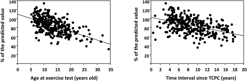 The peak VO2 tended to decrease both with age and with elapsed time in patients after extracardiac total cavopulmonary connection.