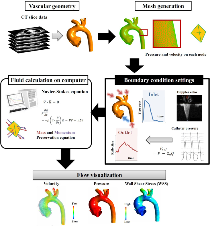 流体シミュレーション(CFD)は関心となる解析領域をメッシュと呼ばれる微小領域で分割し,その各領域の中で血流に関する流量と運動量の保存方程式を近似的にコンピュータに解かせ,メッシュの各点での血流速度ベクトルと血圧情報を得る数値計算の手法である49).血管の形状のみでは流れ場は発生しないので,境界面に物理学的な条件を代入しなければならず,これを境界条件という49).境界条件は数学的な要求から,各境界面で速度または圧力を代入するが,例えば血管壁表面では血管がほとんど動かないと仮定すると壁面に速度0という値を代入することになり,また例えば大動脈の入口部の断端面に心拍出量を血管断面積で除した流速を代入するとそれらしい生理学的な流量になり,また動脈の出口の断端面に計測された血圧値を代入すると生理学的な血行動態に近い血行動態がコンピュータ上で再現されることになる.上述のように流体力学の基礎方程式であるNavier–Stokes方程式の厳密解を求めることは容易ではないので,コンピュータで近似解を求め,方程式の左辺と右辺が限りなく小さな誤差に収まるよう,計算を繰り返す必要がある49).このため膨大な計算量を要し,大型のコンピュータが長時間かけて一心拍の計算をすることになるが,計算を繰り返しても必ずしも誤差が小さくなる方向に向かって行くとも限らず,計算誤差が次第に小さくなっていくことを収束,大きくなっていって計算が終わらなくなってしまうことを発散というが,「これ以下の誤差に収まったら収束とみなす」という条件を収束残差と言い任意に設定することができる.心臓血管系では通常1.0E−5(10の−5乗の意味)前後で設定することが通例であるが,これは例えば流量保存式に関していうならば5 L/minの心拍出量に対して,0.05 mL/min=3 mL/h程度の誤差しかないことを意味しており,不感蒸泄や尿量や水分補液量などと比して充分小さく,誤差の範囲とみなせるレベルであることを意味している.Fig. 5にCFD解析のプロセスを示す.