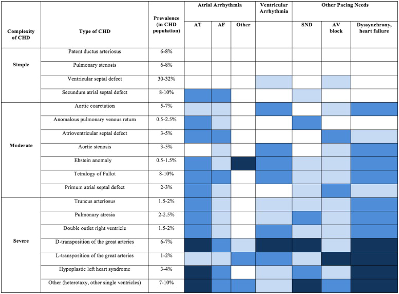 AF, atrial fibrillation ; AT, atrial tachycardia; AV, atrioventricular; CHD, congenital heart defect; SND, sinus node dysfunction