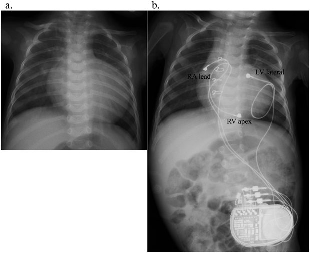 a. CXR before CRT-P implantation. b. CXR 1 month after CRT-P implantation. Three unipolar steroid eluting suture-on type lead (4965 Medtronic) were placed on RA, RV apex and LV lateral wall by left thoracotomy and median sternotomy.