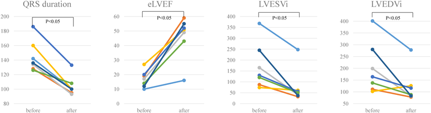 慢性期のreverse remodelingを考えてみると,Fig. 2に示されるように,平均観察期間8.4ヶ月後では全例で劇的にQRS時間の短縮があり,電気的非同期性の改善を来していることがわかる.心室容積と駆出率をみると,心臓移植に至ったCase 1以外では劇的にreverse remodelingが観察されている.