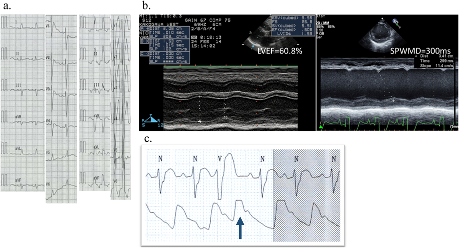 a. 12 leads ECG at 10 days of life (left) and 4months (right) just before CRT-P implantation in Case 3. b. M-mode echocardiography at 10 days of life (left) and 4months (right) just before CRT-P implantation in Case 3. c. Interestingly, arterial pressure monitoring shows the significant elevation of pressure at a single ventricular premature contraction arose from LV.