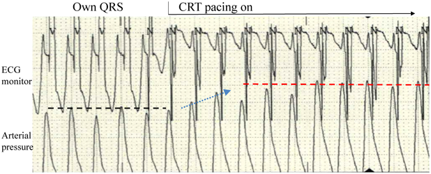 術前は非常に強い肺うっ血が特徴である.強心薬の使用は時に心室内非同期や心室間非同期を強くして状態を悪化させることもあるので注意が必要である.すなわち,改善でき得る心室内(間)非同期が存在する場合は,非同期を改善させた後に慢性心不全治療へ移行することが望ましいと考えられる.すなわち,CRTは急性期治療の一つとして位置付けられるものである.よって可及的速やかにdyssynchronyの評価を行い,CRT治療を行った上で慢性心不全治療の導入を行う必要がある.時に,術前の管理のなかで期外収縮がストレッチした左室より起こることがある.その場合は左室起源の期外収縮により観血的動脈圧モニターで血圧上昇が観察されることがある.これはすなわち左室ペーシングで血圧が上がる可能性を示唆し,CRTによる急性効果を予測させる所見となり得る(Fig. 3c).