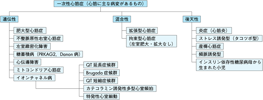心筋症とは,2006年の米国心臓協会(AHA)では「通常不適切な心室の肥大や拡大を呈するような心筋の器質的あるいは電気的異常を有する多様な疾患群」と定義され,「その原因は多岐にわたるがしばしば遺伝性」である.そして主な病変が心臓にあるものを一次性心筋症,全身疾患の心筋病変を二次性心筋症と大別している(Fig. 1, Table 1).一次性心筋症は遺伝性,混合型(遺伝と後天性),後天性の3つに分類される.