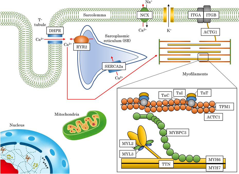 心筋細胞は細胞質に豊富な筋原線維(myofibril)をもち,休むことなく収縮-弛緩を繰り返すことに分化した細胞である.心筋細胞には基本的な収縮ユニットである筋原線維と,興奮収縮連関に重要なカルシウムイオンの貯蔵庫である筋小胞体(sarcoplasmic reticulum),心筋収縮に必要なATPの供給源であるミトコンドリア,核(多核)が存在する(Fig. 2).