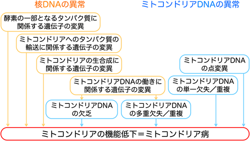 ミトコンドリアの機能異常はミトコンドリアや核の遺伝子変異により引き起こされる(Fig. 3).ミトコンドリアDNAの異常はheteroplasmy(1細胞中における変異ミトコンドリアDNAの混在)が特徴とされる.遺伝形式は母系である.核の遺伝子変異に由来するミトコンドリア病は様々な遺伝子形式を示し,典型的には常染色体潜性遺伝やX染色体遺伝を示すことが多い.