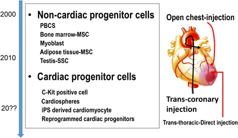 21世紀に入り,これまで種々の細胞種を用いた心筋再生の研究および臨床試験が行われてきた(Fig. 3).当初より末梢血幹細胞,骨髄由来幹細胞,筋芽細胞,脂肪細胞由来間葉系幹細胞などの非心筋前駆細胞が用いられ,複数の症例報告がなされてきたが,これらの細胞は,直接注入であれ経冠動脈投与であれ,移植後の生着や心筋への分化は疑問視され,治療に必要な領域への十分な到達の限界,移植後に生じる新たな不整脈,細胞移植後の効果の持続などの問題が指摘され,いまだ確立された治療法には至っていない3).例えば,骨格筋由来筋芽細胞を用いた100例以上の大規模臨床試験MAGIC(Myoblast Autologous Grafting in Ischemic Cardiomyopathy)がヨーロッパで行われたが,一次エンドポイントである心臓の局所壁運動と心機能において,プラセボ群に対して細胞移植群の有効性が認められず,不整脈発現もあり試験は早期に終了した4).骨髄由来幹細胞を用いた臨床試験も大小合わせて広く行われたが,29のランダム化対照試験のメタアナリシスでは,左室機能のわずかな改善(駆出率で3%程度)にとどまっている5).一方で,2015年に発表されたREGENERATION-DCM clinical trialは,非虚血性の拡張型心筋症60例を対象とした,G-CSF(granulocyte-colony stimulating factor)と骨髄由来幹細胞経冠動脈投与を組み合わせたランダム化二重盲検臨床試験であるが,対照群に比較し治療群では介入後3か月,1年目の心機能(収縮能)の改善が見られ,NT-proBNP値や運動耐容能,NYHA機能分類の改善も見られたと報告されている6).以上のように,非心筋前駆細胞移植を用いた再生医療については今後も検討を続ける必要がある.