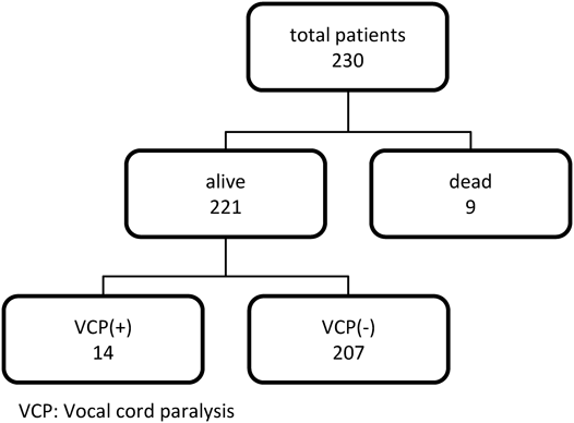 Table 1 Risk factors of vocal cord paralysis (Univariate Analysis)| Variable | Statistics | total (n=221) | Group P (n=14) | Group N (n=207) | p |