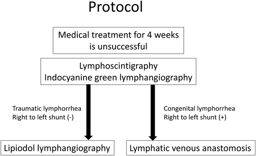 2014年4月以降,われわれが診療を行い6か月以上の経過観察を行った患者12名を対象とした.いずれも4週以上の内科治療で効果が限定的であったために外科治療を要した患児である.日齢30日~2歳(平均月齢9か月,中央値8か月),男女比6 : 6,うち5名は心疾患以外の基礎疾患があった(21 trisomy 3名,難治性水頭症1名,Noonan症候群1名).単心室,極型Fallot四徴症,Ebstein奇形などの重症先天性心疾患が多く含まれている(Table 1).リンパ流の検査・治療として主にリンパ管造影法(インドシアニングリーン(ICG),リピオドール®(LG)),リンパ管静脈吻合術(LVA)を施行した.治療法の選択として右左シャントがない場合にリピオドールリンパ管造影法を行い,右左シャントを有する場合や先天性を疑う場合・浮腫を伴う症例にはリンパ管静脈吻合術を適応とした(Fig. 1).手術は全例,全身麻酔下に行った(Total IntraVenous Anesthesia: TIVA).ICG, LG, LVAはいずれも当院倫理委員会で認可を得て施行した.