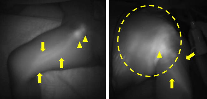 ジアグノグリーン®・注射用液25 mg(第一三共,日本)を付属の溶液または5%ブドウ糖液10 mLで希釈し,足背,手背に各1箇所ずつ,0.05 mLを皮下注射する.注射後,赤外線カメラを用いて体表をくまなく観察する.線状のリンパ流が確認できた部位やリンパ節を示す鼠径部の円形集積部には,それぞれの直上である体表に油性ペンで印をつける.