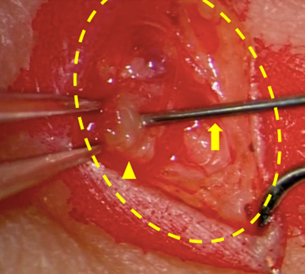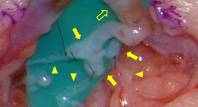 ICGで描出されたリンパ経路のうち,大伏在静脈近傍で近接した部位を術野とする.20万倍ボスミンを加えた0.5%リドカイン液を0.1 mL程度皮下注射することで局所麻酔を行い,1~2 cmの皮膚切開を加える.顕微鏡下に慎重な皮下組織の剥離を行い,集合リンパ管と静脈を露出させる.11-0または12-0ナイロンを用い,2~6針程度縫合し吻合する.吻合部の開通を確認し,皮膚を5-0 PDSで縫合閉鎖する.