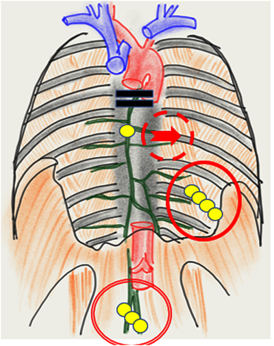 胸腹水に対して近年注目される方法として,胸管塞栓術がある14, 17, 30, 31).胸管を造影したのち直接穿刺し,カテーテルを留置した上で塞栓物質(NBCAやコイルなど)を用いて漏出部または胸管本幹を内部から塞栓する方法である.米国のグループが比較的良好な治療成績を報告しているが,小児や心疾患があるケースでは成功率は成人に比べて低い32).また胸管本幹を塞栓した場合に行き場を失ったリンパ液が腸管や大腿部でうっ滞し,難治性の蛋白漏出性胃腸症や下肢浮腫をきたすことがあり,注意を要する.