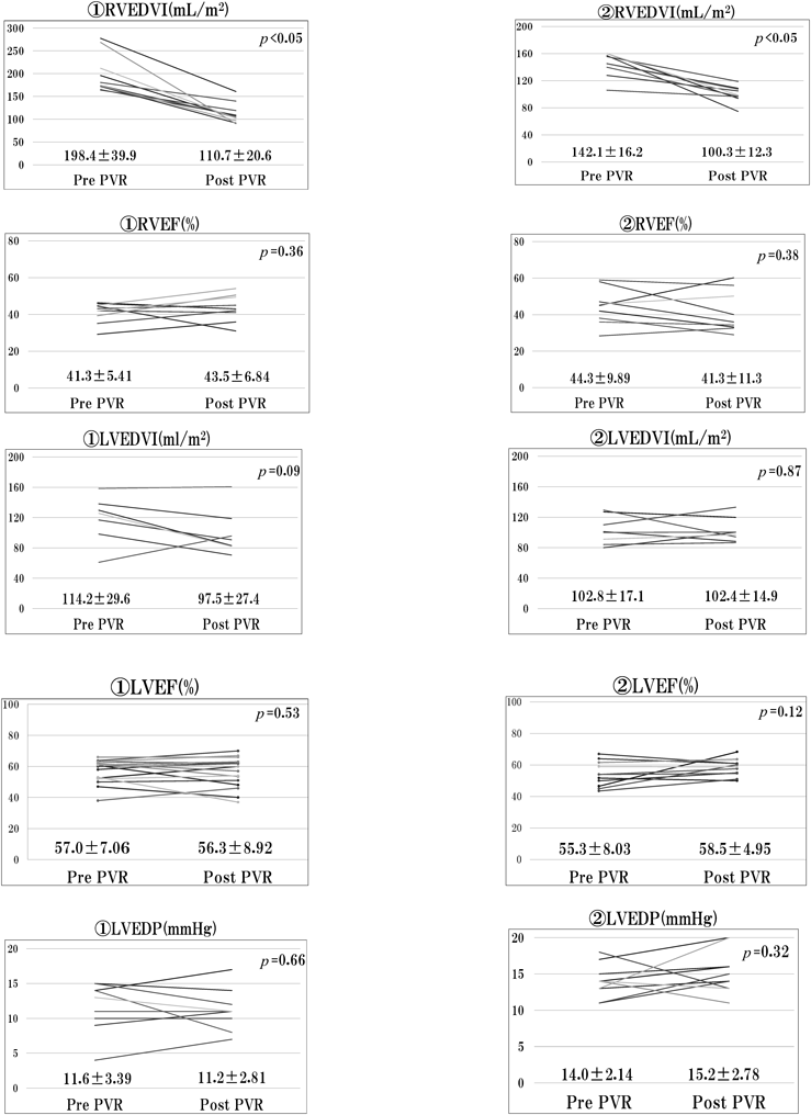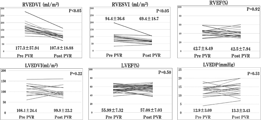 Fig. 1に心臓カテーテル検査の結果を示す.右心機能評価ではRVEDVIは術前177.3±57.94 mL/m2,術後107.8±18.88 mL/m2,RVESVIは術前94.4±36.63 mL/m2,術後69.4±18.7 mL/m2と有意に改善した(p<0.05).RVEFは術前42.7±8.49%,術後41.5±7.94と有意差はみられなかった(p=0.92).左心機能評価ではLVEDVI(left ventricular end-diastolic volume index)は術前108.1±24.4 mL/m2,術後99.9±22.2 mL/m2(p=0.22)と有意差はみられなかった.LVEF(left ventricular ejection fraction)は術前55.9±7.32 mL/m2,術後57.1±7.03 mL/m2と有意差はみられなかった(p=0.50).LVEDP(left ventricular end-diastolic pressure)は術前12.9±3.09 mmHg,術後13.3±3.43 mL/m2と有意差はみられなかった(p=0.53).