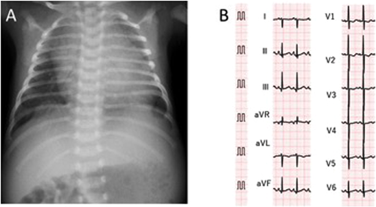 身長50.4 cm,体重3,456 gと発育は良好であった.意識清明,HR 156 bpm,RR 79 bpm,BP 76/46 mmHg,SpO2 92%(室内気)と軽度の低下を認めた.頻呼吸・陥没呼吸が著明であった.胸骨左縁第3肋間にLevine II/VIの収縮期雑音およびLevine II/VIの拡張期雑音を聴取した.肝臓は2 cm触知した.四肢は冷感が著明であり,Capillary refilling time>2秒と末梢循環不全の状態であった.