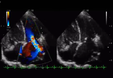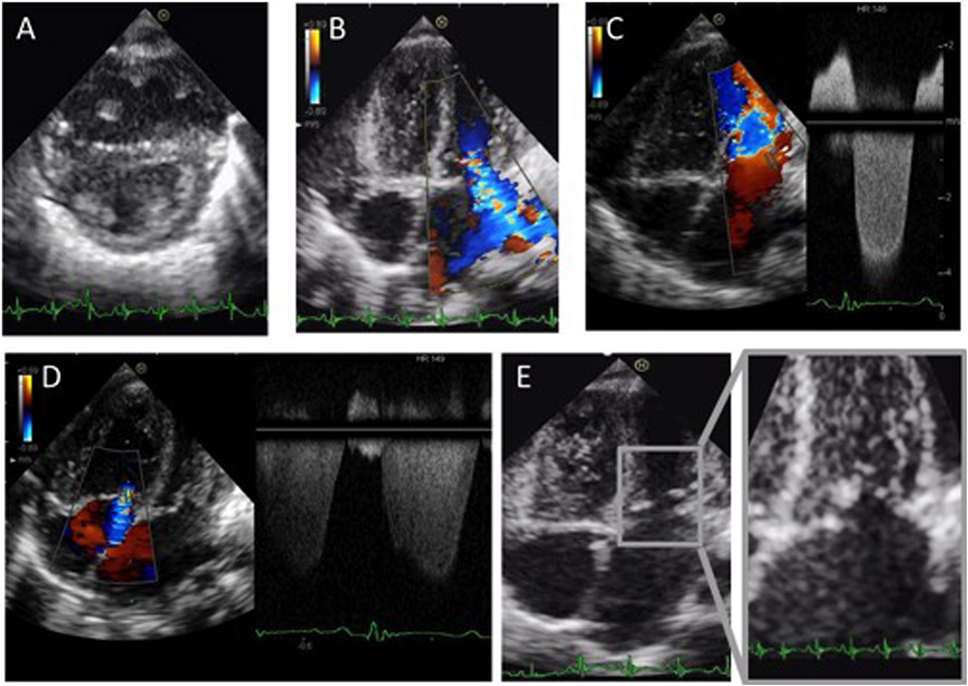 心臓波超音波検査を施行したところ,左室は右室に圧排され狭小化(左室拡張末期径=17.2 mm)しており,高い右室圧が示唆された.moderate-severe MRを認め,MSに関しては,左室流入血流はE peak velocity 2.26 m/secと加速し,mean PGは8.4 mmHgと高値であった.重症MSRを認め,三尖弁逆流圧格差(TRPG)は69 mmHgと高値で,oversystemic PHの状態であった(Fig. 2, Movie 1).