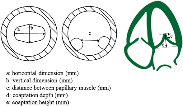 | LVDd, left ventricular end-diastolic dimension; LVDs, left ventricular end-systolic dimension; PG, pressure gradient; TRPG, tricuspid regurgitation pressure gradient. The anteroposterior or vertical dimension and side-to-side or horizontal dimensions are mesured in the short-axis view of their maximal opening at the level of the leaflet tips. Measurement of papillary muscle distance, defined as the distance between the tips of the papillary muscles at the end of systole, was measured on the left ventricular short axis view. Measurement of mitral valve coaptation depth, defined as the distance between the valvular annulus plane and leaflet coaptation was assessed from the apical four chamber view. The coaptation height was defined as the length between the free edge of the leaflet and the anterior and posterior lobes to left atrial surface level at end-systole. |
