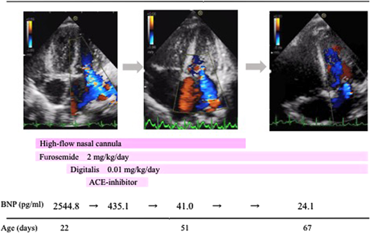 High flow nasal cannula,利尿剤,ジゴキシンによる内科的管理を継続したところ,呼吸状態は安定し,活気および哺乳力等の全身状態も改善となった.胸部レントゲンでは,肺うっ血の改善を認め,入院1か月後にHigh flow nasal cannulaを中止することができ,以降は,室内気で管理した.