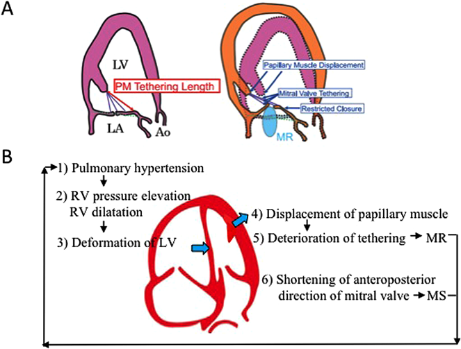 この二次的・機能的MSRの機序に類似した病態が本症例にも存在したと考えた.つまり,生来存在していた先天性僧帽弁異形成に起因する先天性MSRは軽度であり,その上に二次的・機能的MSRが重なることで,MSRが重症化したと推察した.過去に同様の報告はないが,二次的・機能的tetheringによるMRが生じる要因として,生理的および呼吸器感染などに伴う病的な肺高血圧のために右室圧が上昇し,左室が圧排されることで,左室の形態的な変化があったと考えられる.右室圧の上昇,右室容積増大に伴い,心臓全体の拡大と左室の圧排が生じ,1)僧帽弁乳頭筋の外側への偏位,2)乳頭筋間距離の延長が生じて僧帽弁のtetheringが増悪することでMRが重症化した可能性がある.さらに右室圧の上昇に伴う左室の圧排・変形により,3)僧帽弁前後径の短縮が起こり,tetheringとの複合効果でMSが重症化したのではないかと考えた.これはTable 2に示した僧帽弁各計測にも表されているが,高血圧・右室圧上昇に伴う僧帽弁前後径短縮はVertical dimension方向の短縮に影響を与えているものと考えられ,その肺高血圧・右室圧上昇によって左室圧排と乳頭筋外側偏位は,僧帽弁のTetheringを増悪させて,Vertical dimensionおよびHorizontal dimensionをともに小さくしていたと考えられる.この二次的なMSRの増悪によりさらに肺高血圧は進行し,さらにMSRが増悪する,という悪循環である(Fig. 5B).本例において,MSRを増悪させるような高度の肺高血圧の原因は不明な点が多いが,呼吸器感染に加え,生理的肺高血圧の要因があったものと考える.