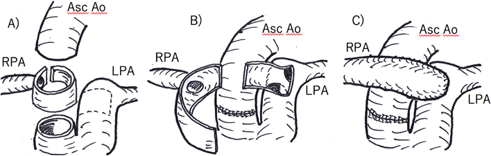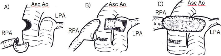 右腕頭動脈送血(3.5 mm ePTFE graft使用),上下大静脈脱血で人工心肺を確立した.大動脈遮断後,大動脈は離断せずに右肺動脈分岐レベルの上方を切開し,大動脈の前壁を舌状に切開しフラップ状にした.大動脈切離面は直接閉鎖した.右肺動脈はdebandingのみで十分な拡大を得られた.心房中隔は直接閉鎖した.大動脈遮断解除し,心拍動下に主肺動脈の前壁を舌状に切り出しフラップ状にした.大動脈前壁のフラップを右肺動脈の前壁に,主肺動脈前壁のフラップを右肺動脈の後壁とし右肺動脈を上行大動脈の全面で再建した(Fig. 4).右肺動脈再建後,右室/大動脈圧比は0.8と高値であり,右肺動脈と右室で圧較差20 mmHg認めたため自己心膜パッチを用いて右肺動脈を拡大した.右肺動脈パッチ拡大後は右室/大動脈圧比は0.55となった.