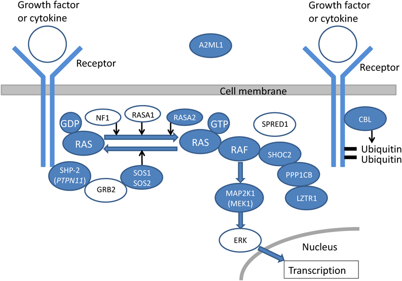Shaded circles indicate the molecules associated with Noonan syndrome or Noonan syndrome-like phenotype. RAS includes HRAS, KRAS, MRAS, NRAS, RIT1 and RRAS. Among them, mutations in RIT1, KRAS, MRAS, NRAS and RRAS were reported in Noonan syndrome or Noonan syndrome-like phenotype. RAF includes BRAF and RAF1. Mutations in RAF1 were also reported in Noonan syndrome. Although BRAF is known as a causative gene in CFC syndrome, some patients with mutations in BRAF show Noonan syndrome phenotype clinically.