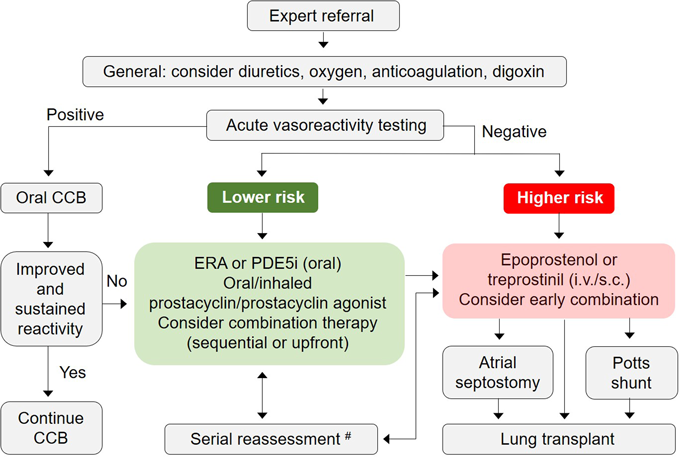 IPAH: idiopathic PAH; HPAH: heritable PAH; CCB: calcium channel blocker; PAP: pulmonary arterial pressure; PVR: pulmonary vascular resistance; LVEF: left ventricular ejection fraction; RCT: randomised controlled trial; WHO: World Health Organization; FC: Functional Class; WU: Wood Units; mPAP: mean PAP. [Adapted from Ref.10)] |