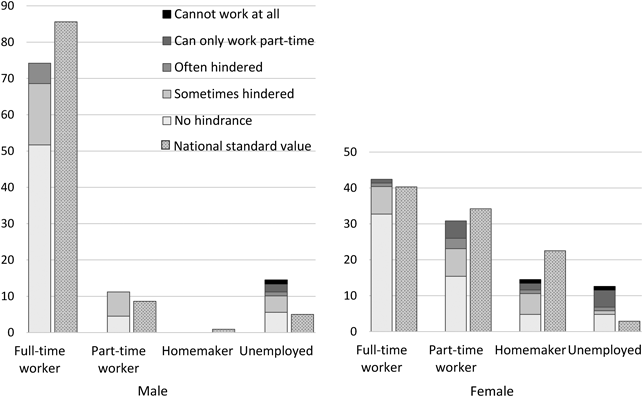 対象者の男女別の就業状況(Table 2を参照),および国民標準値(男:常勤職85.6%,非常勤職8.6%,専業主夫0.9%,未就業5.0%;女:常勤職40.3%,非常勤職34.2%,専業主婦22.5%,未就業2.9%)をFig. 1に示し,患者群については患者自身が評定した心疾患を起因とする就業支障評価を就業状況に重ねて示した.