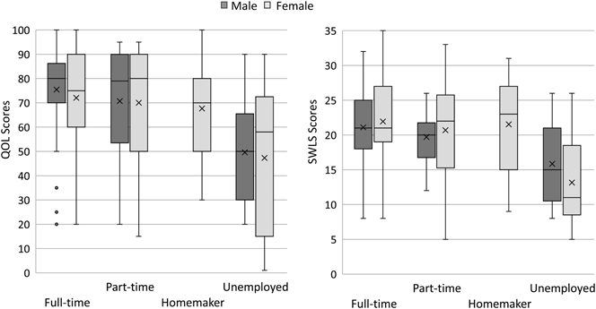 就業状況における患者のQOL,および生活満足度をFig. 2に示した.男女ともに有意差が見られ(QOL:男p=0.002,女p=0.039;生活満足度:男p=0.014,女p=0.003),男性患者ではQOL,生活満足度ともに未就業者は常勤者より低く(QOL:p<0.01;生活満足度:p<0.05),女性患者ではQOLについて未就業者は常勤者,非常勤者より低く(p<0.05),生活満足度について未就業者は常勤者,非常勤者,専業主婦よりも低かった(未就業者と常勤者:p<0.01;未就業者と非常勤者,専業主婦:p<0.05).
