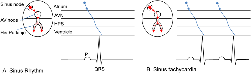 Sinus rhythm (A), and sinus tachycardia (B). AVN, atrioventricular node; HPS, His-Purkinje system