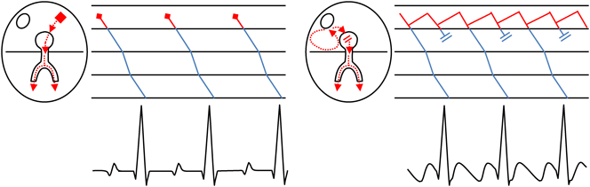 QRS波から次に出現するP波までの間隔であるRP′間隔をPR間隔と比較する.RP′間隔がPR間隔より短い場合はShort RP′型頻拍,長い場合はLong RP′型頻拍と呼ばれる.多くの房室副伝導路を逆行伝導する正方向性AVRTではQRS波の少し後に逆行性P波が出現するために,RP′間隔はPR間隔より短く,Short RP′型頻拍を呈する.SPを順行伝導し,FPを逆行伝導する通常型AVNRTではRP′間隔が短く,逆行性P波がQRS波に埋没して観察できないこともある.また,QRS波に逆行性P波が一部重なり,QRS波の一部と見えることから,V1誘導でのPseudo R′波,下壁誘導でのPseudo S波を形成することがある.伝導特性によってはP波がQRSに先行することもあり,下壁誘導でPseudo Q波を呈することがある.EATではP波に引き続きQRS波が出現し,P波は先行するQRS波には依存しないため,RP′間隔は変動するが,一般にLong RP′型頻拍となる.ただし,1度房室ブロックを合併していると,P波に引き続くQRS波よりも先行するQRS波のほうが近くなるとShort RP′となることもある.伝導の遅い特殊な房室副伝導路を逆行するPJRTや,速伝導路Fast pathway(FP)を順行伝導して遅伝導路Slow pathway(SP)を逆行伝導する非通常型AVNRTでは,QRS波から次の逆行性P波が出現するまでに時間を要するためにLong RP′型頻拍となる.