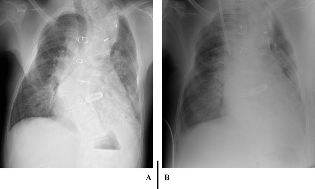 CHDF導入時の胸部X線(Fig. 1B)では,心胸郭比67.7%と心拡大および肺うっ血の増強と両側胸水を認めた.CHDF開始直後に血圧低下,嘔気が出現したため,CHDFを一時中断した.しかし,その後も症状の改善がないためいったん回路を離脱した.CHDF離脱後の心エコーでは,下大静脈の虚脱と左心室の過収縮を認め,脱血による血管内容量の不足を疑い,補液の増量とmilrinoneの減量を行った.プライミングを生理食塩液から赤血球液に変更し,抗凝固薬をnafamostat mesilateからheparin sodiumに変更した上でCHDFを再導入したところ,症状の再燃を認めなかったため除水を開始した.その後も血圧は安定していたため,補液を減量しmilrinoneを再増量した.徐々に呼吸困難が出現し,両側肺野で湿性ラ音を聴取したため,肺うっ血の増強を疑い除水速度を上げて対応した.また,血管透過性の亢進や低アルブミン血症の影響を考慮し,prednisolone 2 mg/kg/dayと25% albuminの投与を行った.CHDF導入2日目には顔面の浮腫や呼吸困難は改善し,血液ガスでpH 7.334, HCO3 −19.4 mmol/L, BE −5.8 mEq/Lと代謝性アシドーシスの改善を認めた.脱水傾向で除水速度を下げたが,その後徐々に血圧が上昇し,収縮期血圧200 mmHgと高血圧を認めた.除水速度を上げmilrinoneを増量したが改善しないため,nicardipine hydrochlorideの投与を開始したところ,血圧は正常域に改善した.CHDF導入4日目にはSCr 0.97 mg/dLまで低下したものの,尿量は増加傾向なく胸水の再貯留を認めたため,輸液を減量し,除水速度を上げて対応した.CHDF導入6日目から利尿薬の投与に反応を認めるようになったため,導入7日目にCHDFを一時中止した.その後もSCrの上昇や代謝性アシドーシスの再燃なく,自尿で3,100 mL/dayと十分量保たれていたため,導入8日目にCHDFを離脱した.離脱後も腎機能の増悪や乏尿の再燃はなく,CHDFの再導入を必要としなかった.退院時の腎機能および尿所見は入院前と同程度に改善していた(Table 1).
