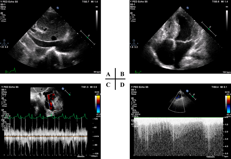 心臓カテーテル検査前日の血液検査(Table 1)で,BUN 40 mg/dL, SCr 0.79 mg/dL, SCrから推定した糸球体濾過量(eGFRcreat) 69.9 mL/min/1.73 m2と,軽度の腎機能低下を認めた.随時尿で150 mg/gCrの微量アルブミン尿を認め,潜血は陰性だった.同日の胸部X線(Fig. 1A)では,心胸郭比63.3%と定期外来受診時と同程度の心拡大および肺うっ血所見であった.入院22日目の心エコー検査では,下大静脈径14.9 mmと拡大し,呼吸性変動は乏しかった(Fig. 2A).両心房の拡大を認め(Fig. 2B),心房間交通は8.9 mmと狭小で右左短絡であった(Fig. 2C).右BTシャント血流は明瞭に描出できたが(Fig. 2D),左BTシャント血流は描出できなかった.