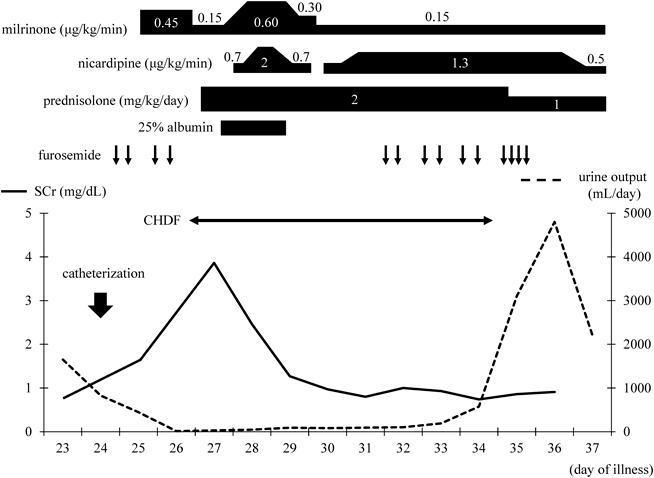sulbactam/ampicillin(SBT/ABPC)の投与と補液(100 mL/kg/day)を開始した.入院翌日には解熱し利尿も良好となり,入院3日目に維持輸液(60 mL/kg/day)に変更し,入院6日目にSBT/ABPCを中止した.しかし入院7日目に顔面の浮腫や尿量減少が出現し,体重24.1 kgと増加を認めた.心エコー検査で著変なく,furosemideの静脈内投与を行い尿量は軽度増加したものの,体重は24 kg前後と変化を認めなかった.入院12日目にBUN 29 mg/dL, SCr 0.66 mg/dLと脱水所見は改善したものの,BNP 376.2 pg/mLと上昇し,倦怠感や腹部膨満,下痢の出現もあり,右心不全の増悪と判断して内服薬のfurosemideとspironolactoneを30 mg/dayから40 mg/dayに増量した.その後,体重23.1 kgまで減少したが下痢は改善せず,BUN 35 mg/dL, SCr 0.81 mg/dLと脱水所見と腎機能の増悪を認め,利尿薬の増量と心不全の増悪による,腎血流減少・腸管浮腫の状態と考えられた.SpO2 80%程度に対してHb 12.5 g/dLと相対的貧血と判断し,入院18日目に赤血球輸血2単位を施行した.その後も倦怠感や下痢は改善せず,入院20日目にmilrinone 0.3 µg/kg/minの投与を開始した.入院22日目からfurosemide 1 mg/kgの静脈内投与に反応した尿量の増加と,倦怠感や下痢の改善を認めた.同日milrinoneを0.15 µg/kg/minに漸減し,入院23日目に中止した.