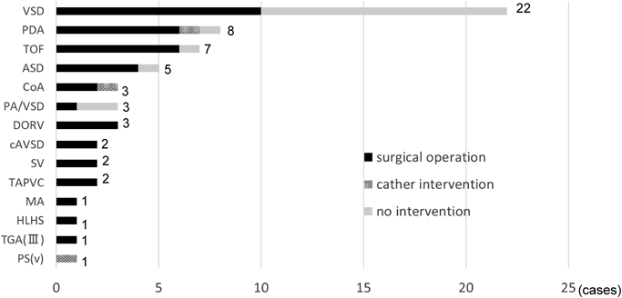心疾患の主診断は心室中隔欠損22例,動脈管開存8例,Fallot四徴7例,心房中隔欠損5例,大動脈縮窄,肺動脈閉鎖兼心室中隔欠損,両大血管右室起始が各3例,完全型房室中隔欠損,単心室,総肺静脈還流異常が各2例,僧帽弁閉鎖,左心低形成症候群,完全大血管転位,肺動脈狭窄が各1例であった.61例中43例(70%)が心疾患に対する治療介入を必要としその内訳は,外科手術40例,カテーテル治療3例であった.カテーテル治療の内訳は肺動脈狭窄に対するバルーン拡大,大動脈縮窄に対するバルーン拡大,動脈管に対するコイル塞栓術が各1例であった.