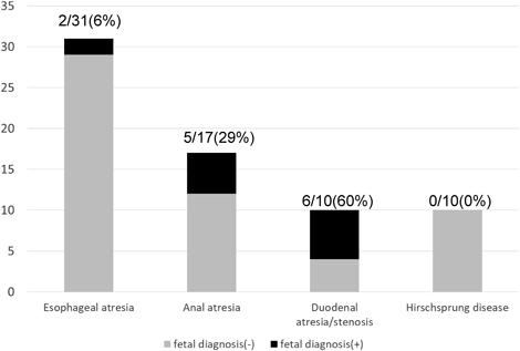 今回消化管疾患・心疾患とも緊急性を要した症例が1例あった.C型食道閉鎖,大動脈縮窄,両大血管右室起始,左室低形成,CHARGE症候群の例で,出生後,肺血流増多のために日齢1に緊急的に両側肺動脈絞扼術を施行し,循環動態を安定させたうえで日齢3に食道閉鎖根治術を行った.その後,日齢26に大動脈縮窄修復術を施行した.この症例は,食道閉鎖根治術前に肺血流量適正化のための心臓手術が必要であった.麻生らは,胎児診断された症例で24時間以内の超緊急手術例が多く施行できるようになっており,出生前より消化管疾患・心疾患に対して個々の症例に応じた介入を計画し,準備できるので,出生前診断は有用であると報告している6).しかし今回の検討では,消化管疾患の胎児診断例が13/61例(21%)と未だに少なく,改善が必要である.