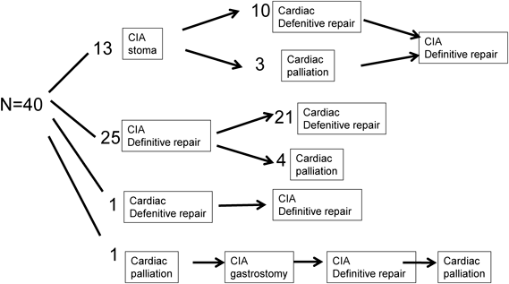 心疾患の初回手術時期は,日齢1~5歳(中央値3か月)で新生児期は18例であった.消化管疾患の初回手術時期は日齢0~2歳(中央値2日)であった.心疾患,消化管疾患ともに手術したものが40例(66%)でその治療経過をFig. 3に示す.内訳は1)消化管姑息手術→心臓手術→消化管根治術の順であったものが13例,2)消化管根治術→心臓手術が25例,3)心臓手術→消化管根治術が2例であった.38例は消化管疾患の手術を先行し,その後心臓手術を行っていた.