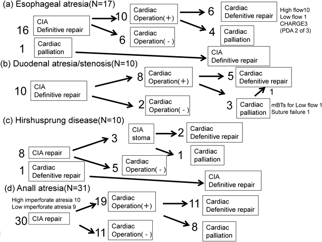 ここから,消化管閉塞症と先天性心疾患ともに手術を行なった40症例に関して消化管閉鎖症の疾患別にサブグループ(食道閉鎖,十二指腸閉鎖・狭窄,Hirschsprung病,鎖肛)に分けて検討する(Fig. 4).