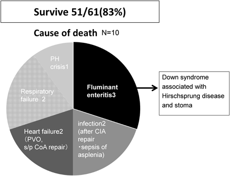 全体の生存率は51/61例(83%)であった.死亡10例の死因は劇症型腸炎による脱水3例,感染2例,心不全2例,呼吸不全2例,肺高血圧クリーゼ1例であった.染色体異常は61例中31例(51%)であったが,死亡例10例の中では7例(70%)であった.消化管疾患が死因となったのは4例で,うち3例はHirschsprung病で人工肛門を造設したDown症候群で,死因は劇症型腸炎による急激な脱水を契機とした末梢循環不全であった(Table 1).3例とも胃腸炎発症から10~20時間以内に死亡するという非常に急激な経過を辿っていた.消化管疾患が死因となった4例の残り1例は食道閉鎖術後の敗血症であった.