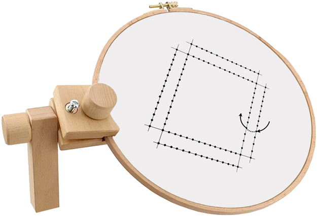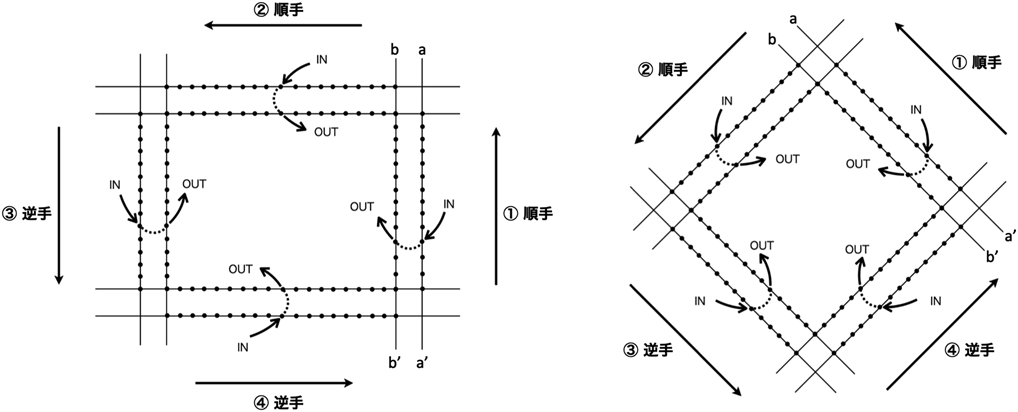アナログ的にはなりますが,私が若手の頃に行ってきたトレーニングを紹介します.刺繍用の木枠に布を張って,その木枠を色々な角度で固定をして縫合の練習を行いました(図1).この布には図2に示すようなグリッドを描いて,刺入点(図2, a–a′線上のIN点)から刺出点(図2, b–b′線上のOUT点)に縫います.図2では,①②は順手,③④は逆手による縫合になります.まず,正確にIN点からOUT点に縫えるようにして,次に時間を決めてスピードを上げて,かつ正確に縫うようにしました.縫合針は必ず面に対して垂直に刺入することを心がけました.これを色々な角度で練習をすることにより,実際の心臓を縫合する際に,どの面ではどの縫い方(順手なのか逆手なのか)を瞬時に判断できるようになります.