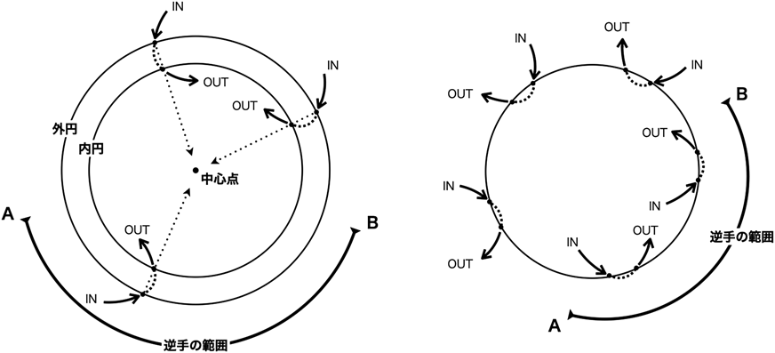 また図3に示すように円上の刺入点(図3左,外円上のIN点)から中心点に向かって刺出点(図3左,内円上のOUT点)に縫う練習を行いました.AからBの範囲は逆手になり,それ以外の範囲は順手での縫合が可能です.この練習はVSD閉鎖,弁置換での縫合練習になります.さらに,円周上に刺入点(図3右,IN点)から刺出点(図3右,OUT点)を縫う練習はタバコ縫合の基本的な練習となります.これもどの範囲で順手,逆手を使い分けるかを体得するのに有用であると思います.Konno手術を開発された今野草二先生は持針器を使って実際に刺繍を行う練習をされていたようです1).