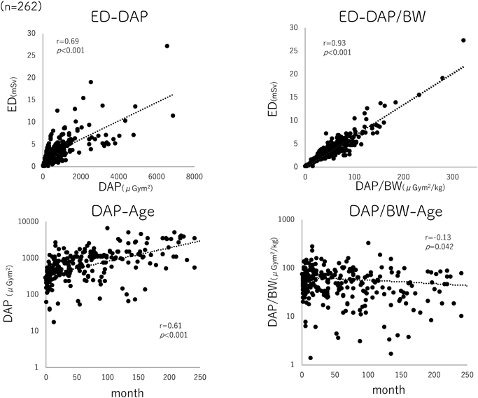 最初に,被ばく線量モニタリングとしてのDAP/BWの有用性の検討として,EDとDAPおよびDAP/BW,月齢との関係をFig. 1に示した.EDはDAP/BWと強い相関関係を示し(r=0.93,p<0.001),DAPは月齢と相関関係にあったが(r=0.61, p<0.001),DAP/BWは月齢との相関はなかった(r=−0.13, p=0.042).