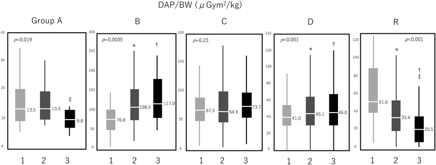 従来の被ばくに関するデータの結果をTable 3, DAP/BWの結果をFig. 2に示した.欠損値は期間①; 5.8%,②; 5.7%,③; 3.5%だった.A群では,FTは年代とともに増加傾向だったが(① vs ②: p=0.021,① vs ③: p<0.001,② vs ③: p=0.0023),AK, DAPは年代ごとに差は認めなかった.一方でDAP/BWは期間③で低く,期間②と③の間に有意差を認めた(② vs ③: p=0.037).B群は全てのパラメーターにおいて期間③で高い傾向にあり,DAP/BWは期間①と②,期間①と③で有意差を認めた(AK:① vs ③: p<0.001, FT:① vs ③: p=0.0025,② vs ③: p=0.0032, DAP:① vs ③: p=0.004, DAP/BW:① vs ②: p=0.014,① vs ③: p<0.001,).年代ごとの変化の詳細については後述する.C群では,AK, FTは期間③で高かったが(AK:① vs ③: p=0.0013,② vs ③: p=0.0025, FT:① vs ②: p=0.0043,① vs ③: p<0.001,② vs ③: p=0.001),DAP, DAP/BWは差を認めなかった.D群は全てのパラメーターで期間③で高い傾向にあり,DAP/BWは期間①と②,①と③の間で有意差を認めた(AK:① vs ②: p<0.001,① vs ③: p<0.001,② vs ③: p<0.001, FT:① vs ②: p<0.001,① vs ③: p<0.001,② vs ③: p=0.001, DAP:① vs ②: p<0.001,① vs ③: p<0.001,② vs ③: p<0.001, DAP/BW:① vs ②: p<0.001,① vs ③: p<0.001).R群では,年代とともに全てのパラメーターが減少傾向で,DAP/BWは有意に減少していた(AK:① vs ②: p=0.0093,① vs ③: p<0.001,② vs ③:p=0.0016, FT:① vs ②: p<0.001,① vs ③: p<0.001,② vs ③: p=0.0015, DAP:① vs ②: p=0.0021,① vs ③: p=0.0039, DAP/BW:① vs ②: p=0.006,① vs ③: p<0.001,② vs ③: p=0.0075).