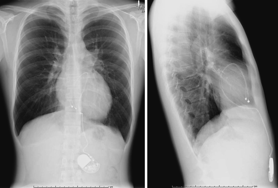 心胸郭比46%,うっ血なし,正面像で心外膜リードは心陰影の内側に偏位し,側面像で右室心尖部の電極から心背側に向かってループを形成していた(Fig. 2).