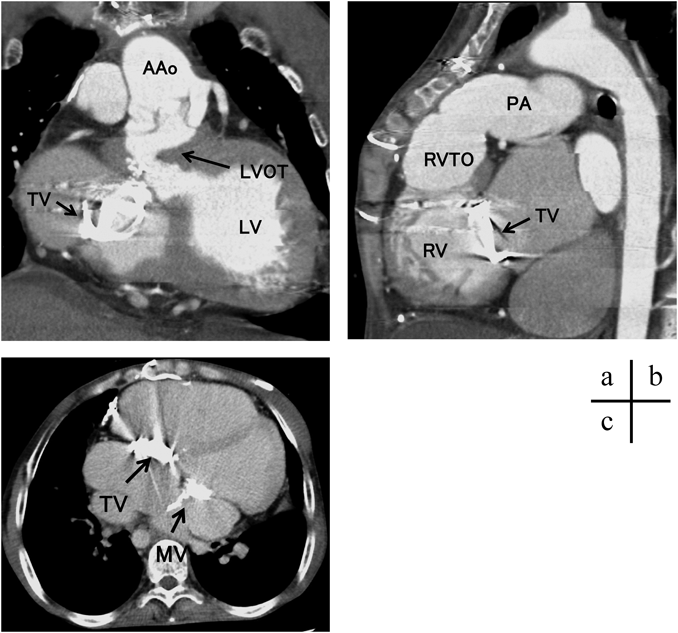 右房圧19 mmHg,左室収縮期圧164 mmHg,左室拡張末期圧16 mmHg,上行大動脈圧90/40 mmHg,左室—大動脈引き抜き圧較差77 mmHg,左室駆出率47%,左室拡張末期容積215% of normal, Sellers III度の大動脈弁逆流を認めた.3年前に比較して左室流出路狭窄と大動脈弁閉鎖不全の進行が確認された.機械弁のために右室および肺動脈圧測定や右室造影はできなかったがMDCTで両心室が同等に拡大していることから,左室同様に右室の強い容量負荷も推測された.三尖弁位人工弁直前の右房から下大静脈への引き抜き圧較差はなくMustard procedureによる心房内血流転換による狭窄は認めなかった.