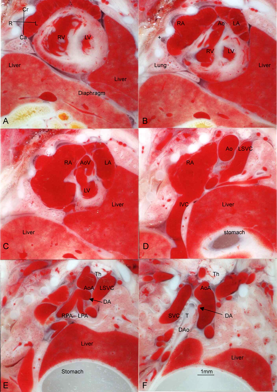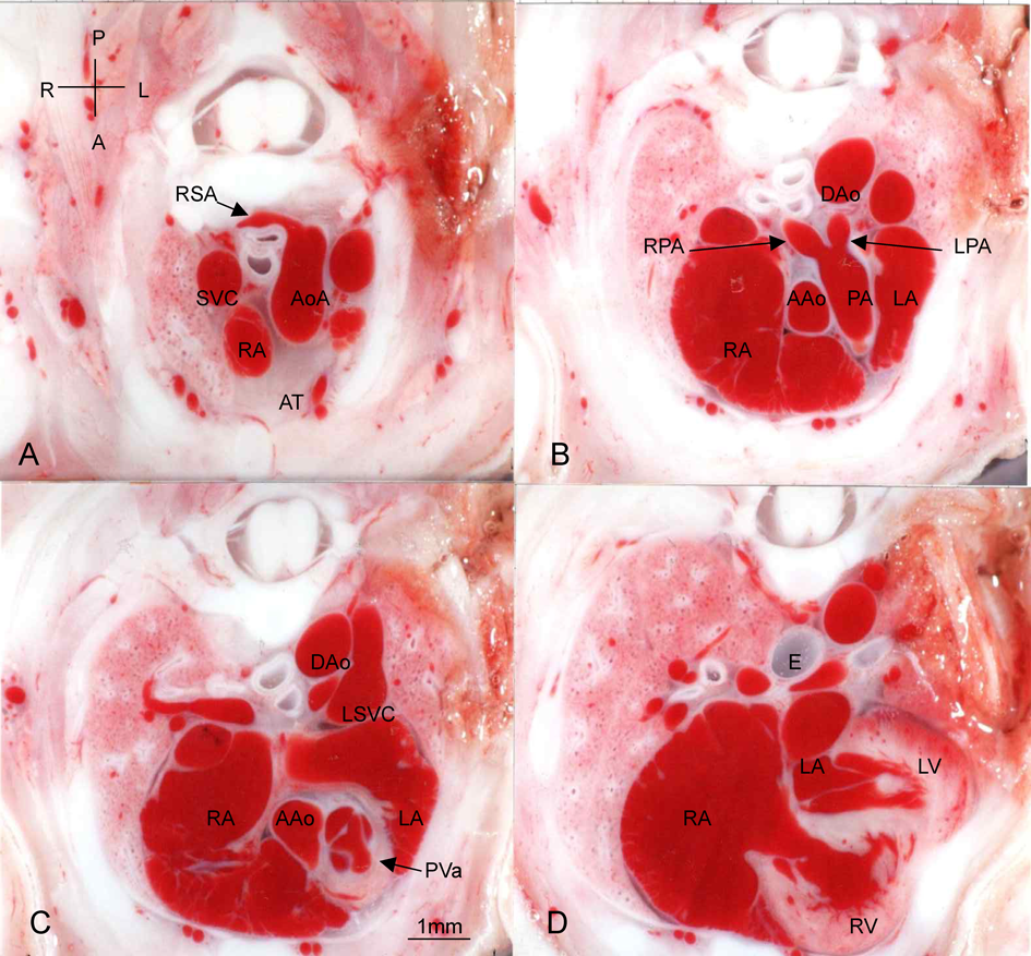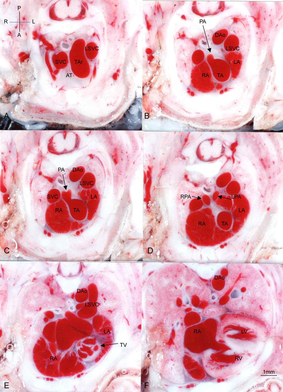 総動脈幹遺残(TA)は円錐から動脈幹にかけての中隔形成不全1)で発生し,新生児期に手術が必要なので早期胎児診断2, 3)が必要である.染色体22q11.2欠失症候群はFallot四徴症などの先天性心疾患を約80%に合併4)し,欠失部位に心臓発生初期に円錐動脈幹中隔形成に関与する遺伝子TBX14)が含まれ,本症候群の胎児の31%が総動脈幹遺残を合併すると報告4)されている.催奇形薬bis-diamineを妊娠ラットに大量投与するとその胎仔に胸腺低形成と心臓大血管疾患(conotruncal anomaly),即ちFallot四徴症,総動脈幹遺残(TA),心室中隔欠損,共通房室弁口,大動脈弓離斷,血管輪を生じる5–8).即ち330匹の胎仔に認められた心疾患とその発生率を括弧内に示すと,各種のFallot四徴症(合計68%,即ち,通常型16%,肺動脈弁欠損型9)14%,肺動脈弁閉鎖型38%),総動脈幹遺残17%(van Praagh分類1, 2) type 1: 9%, type 2: 8%),大動脈弓離断2%,心室中隔欠損3%,共通房室弁口2%などであり,更に血管輪,胸腺の低形成性(100%),横隔膜ヘルニア10)(10%)の合併があった.Bis-diamineでラットに生じる病変は染色体22q11.2欠失症候群4, 11, 12)の病像に酷似している.私は最近2年間にbis-diamineによりラット胎仔に生じた先天性心疾患の連続断面カラー写真を図譜9, 13)として本学会雑誌に発表した.ここに含まれる先天性心疾患中で総動脈幹遺残は特に早期診断,胎児診断が重要2, 3)である.ここには前図譜13)に紙面の都合で掲載できなかった各種総動脈幹遺残の横断面像を図示する.これらのカラー図譜は総動脈幹遺残の胎児エコー診断2, 3)の一助となる可能性がある.