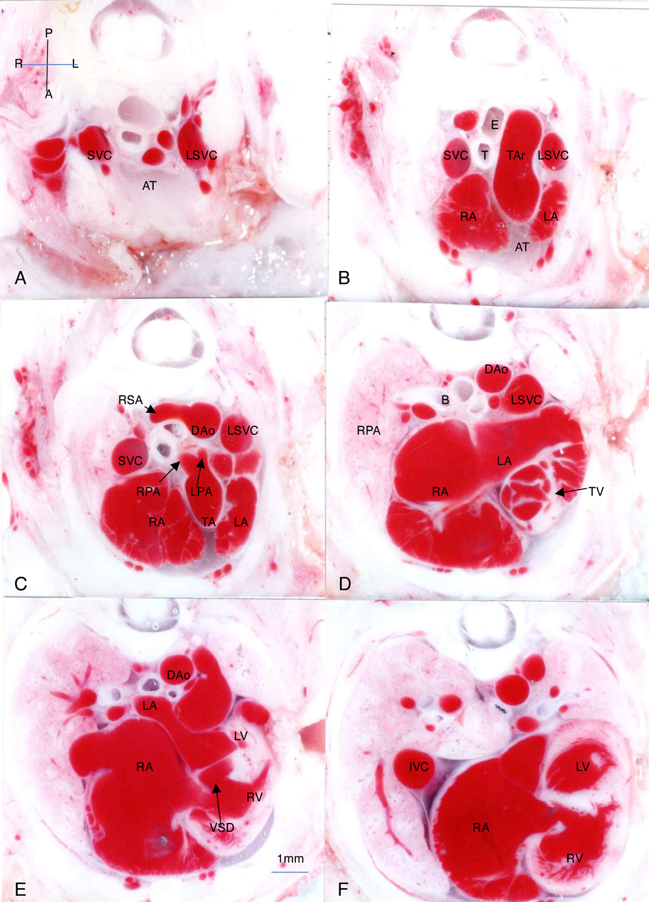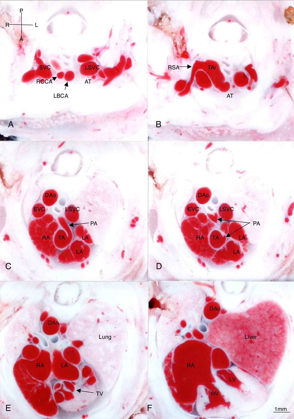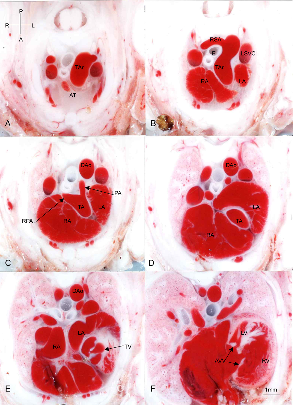 総動脈幹遺残(TA)は円錐から動脈幹にかけての中隔形成不全1)で発生し,新生児期に手術が必要なので早期胎児診断2, 3)が必要である.染色体22q11.2欠失症候群はFallot四徴症などの先天性心疾患を約80%に合併4)し,欠失部位に心臓発生初期に円錐動脈幹中隔形成に関与する遺伝子TBX14)が含まれ,本症候群の胎児の31%が総動脈幹遺残を合併すると報告4)されている.催奇形薬bis-diamineを妊娠ラットに大量投与するとその胎仔に胸腺低形成と心臓大血管疾患(conotruncal anomaly),即ちFallot四徴症,総動脈幹遺残(TA),心室中隔欠損,共通房室弁口,大動脈弓離斷,血管輪を生じる5–8).即ち330匹の胎仔に認められた心疾患とその発生率を括弧内に示すと,各種のFallot四徴症(合計68%,即ち,通常型16%,肺動脈弁欠損型9)14%,肺動脈弁閉鎖型38%),総動脈幹遺残17%(van Praagh分類1, 2) type 1: 9%, type 2: 8%),大動脈弓離断2%,心室中隔欠損3%,共通房室弁口2%などであり,更に血管輪,胸腺の低形成性(100%),横隔膜ヘルニア10)(10%)の合併があった.Bis-diamineでラットに生じる病変は染色体22q11.2欠失症候群4, 11, 12)の病像に酷似している.私は最近2年間にbis-diamineによりラット胎仔に生じた先天性心疾患の連続断面カラー写真を図譜9, 13)として本学会雑誌に発表した.ここに含まれる先天性心疾患中で総動脈幹遺残は特に早期診断,胎児診断が重要2, 3)である.ここには前図譜13)に紙面の都合で掲載できなかった各種総動脈幹遺残の横断面像を図示する.これらのカラー図譜は総動脈幹遺残の胎児エコー診断2, 3)の一助となる可能性がある.