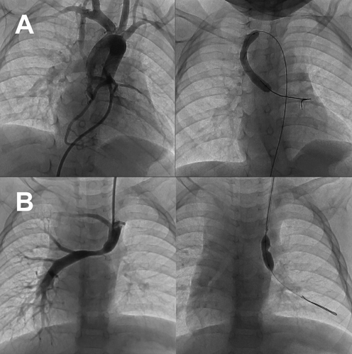 カテーテル治療術前に,呼吸循環の安定性,不整脈,出血傾向,他の臓器病変や染色体異常の合併などを含めた標準的リスク評価を行うのは当然ながら,病変の性状や血行動態に応じたリスク評価も併せて行う必要がある.例えば,術後病変かどうかは周辺組織の癒着の有無に関連し,癒着がなければ血管解離・損傷は危機的状態へ直結する可能性がある.対象病変の血圧も重要で,肺動脈狭窄であっても肺動脈狭窄中枢側が高圧となっている場合や肺高血圧合併例などは注意すべきである.また術後病変であれば血管形成方法(直接吻合・自己心膜パッチまたは伸展加工ポリテトラフルオロエチレンパッチによる形成)は病変硬度や石灰化に関係し,後述するバルーンの種類・サイズ選択への影響のみならずバルーン破裂のリスクを孕む.術後経過時間も考慮すべきで,縫合部安定の観点から術後6週間以上の間隔をおいてカテーテル治療することが一般的であり,私たちも術後3か月以降で治療することを基本とする.生命危機的状況の脱却や補助循環からの離脱を目的とすれば術後超早期介入も許容されるが,バルーン径は狭窄部に対して200%未満に抑え加圧も控えめにするなど手加減が必要であり,その判断は熟練者のみ許されるだろう17–19).