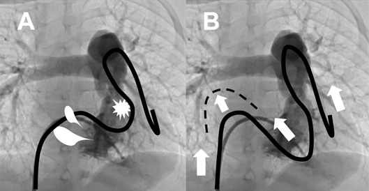 ガイドワイヤー挿入後,親カテーテルを抜去する際にはガイドワイヤー先端が抜けないよう透視下で位置を確認しながらガイドワイヤーを保持して(少し挿入するような感覚で)親カテーテルのみ抜去することが基本手技となる.この際には体外のカテーテルやガイドワイヤーがたわまず直線的になるよう心掛ける.不用意な「たわみ」はガイドワイヤーやカテーテル先端に抜けてくる力が加わるからである.バルーンカテーテルに交換する際はガイドワイヤーをよく濡れたガーゼで湿らせ滑りをよくするとともに血栓等を除去しながら挿入してゆく.この際,バルーンカテーテルとガイドワイヤーの「取り引き」が必要である.主術者一人で操作する時は,左手でバルーンカテーテルのシース側を把持し,右手の人差し指と親指でバルーンカテーテルの尾部を,薬指と小指でガイドワイヤーを把持してガイドワイヤーを少し引き抜く感じで左手と右手でカテーテルを挿入してゆくとよい.助手と協働で行う時は,主術者がバルーンカテーテルを挿入してゆく際,助手はバルーンカテーテルの尾部を左手で,ガイドワイヤーを右手で把持しながら右手のガイドワイヤーを固定してカテーテル尾部を送ってゆくように心がける.この際にも体外のカテーテルとワイヤーが直線状になるよう心掛ける.ガイドワイヤーの挿入が浅かったりシステム全体の支持力が弱いと,屈曲した病変へバルーンカテーテルを挿入する際にガイドワイヤーが抜けてしまうことがあるので,前述のようにガイドワイヤーは病変を超えて十分深く挿入することが重要であるとともに,バルーンカテーテルをあらかじめ体外で「扱いておく」と通過しやすくなる.またバルーンカテーテルのデリバリーに際しシステム全体への過度のテンションは三尖弁や右室流出路の圧迫による血行動態破綻を招くこともあるためガイドワイヤー・カテーテルが自然な位置となるよう常時調節する.また強いテンションのためガイドワイヤーやカテーテルが右房内でS字状となった場合に先端が抜けてくることがあり,焦ってシステムを押すと更に先端が抜けてしまう(Fig. 5).そのため助手は不用意にガイドワイヤーを押し込まないよう注意が必要である.逆にシステムを少し引くことで修正される.症例によっては意図的にループを形成することによりデリバリーシステム全体が安定することもあるので症例ごとにデリバリー方法を工夫することも必要となる.